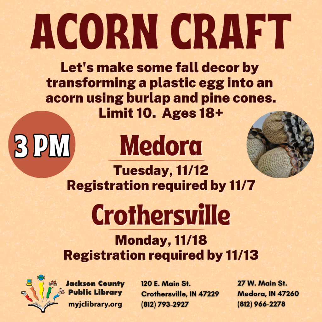 Register for Crothersville: https://jacksoncounty.librarycalendar.com/event/crothersville-acorn-craft-63