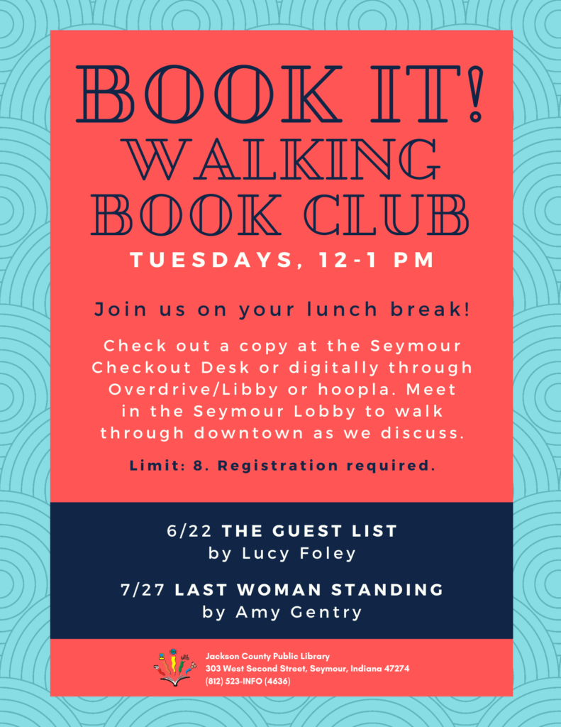 Book It! Walking Book Club You need to register for this one and pick up the book before the date of the walk. Please register here for the following dates: June 22 July 27