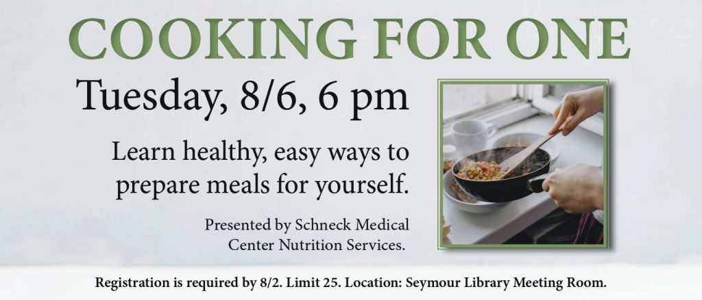 Cooking for One Schneck Medical Center Nutrition Services Clinical Coordinator Lesley Kendall will demonstrate healthy, easy ways to prepare meals for yourself.
