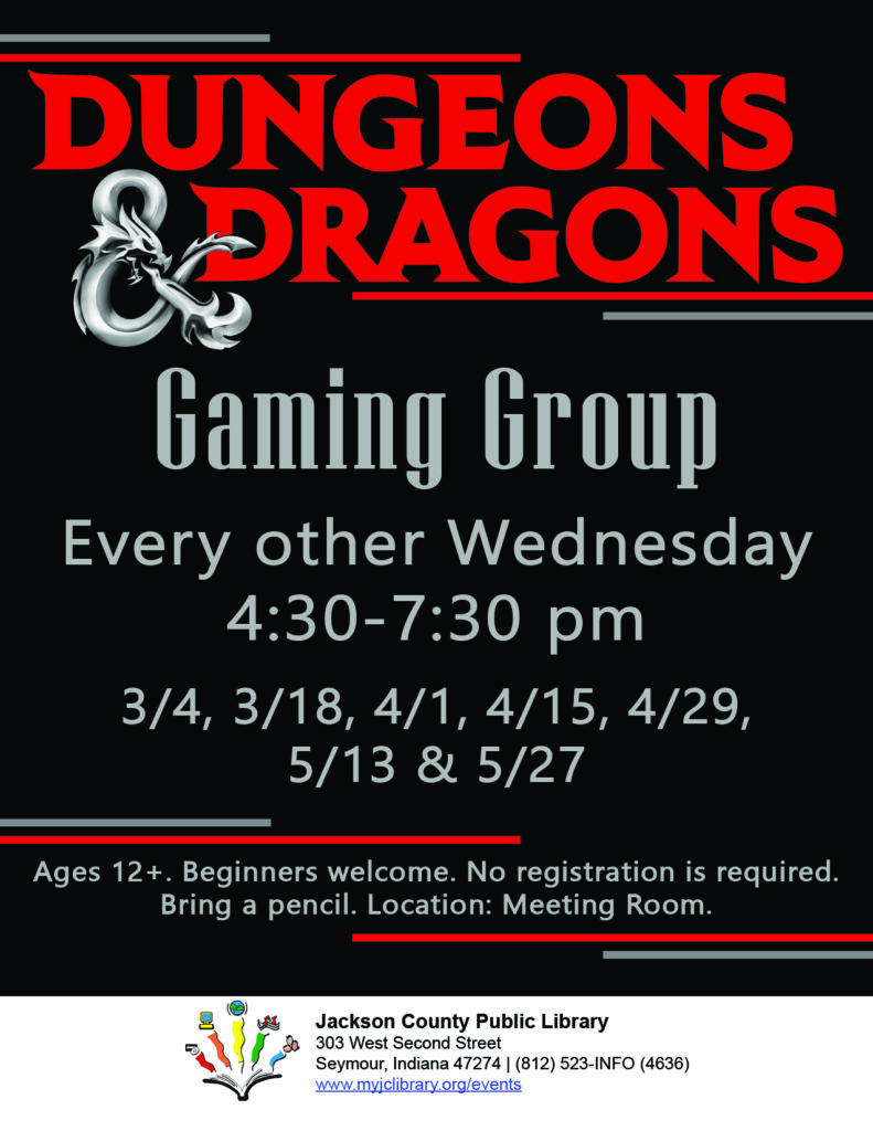 Dungeons and Dragons Create a character and join the group. May’s meetings are on the 13th and the 27th.