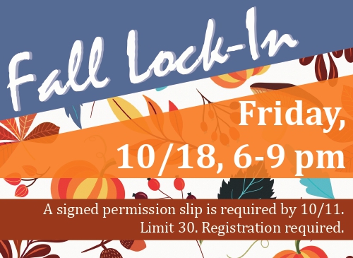 Fall Lock in for Teens Pizza! Games! Pumpkin decorating! Sign up by October 11. Don’t wait! There’s a limit of 30. Sign up here.