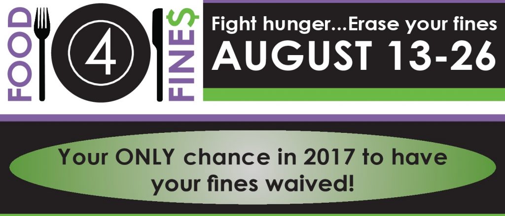 Individuals without library fines wishing to donate food items may do so at any library location.