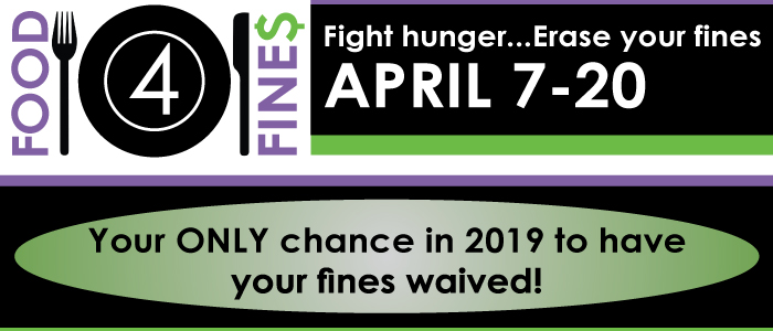 Food for Fines April 7-20 Bring in non-perishable items. Each item will erase one dollar off your fines. Ramen noodles require six packs to get a dollar off. Help the hungry and yourself at the same time.