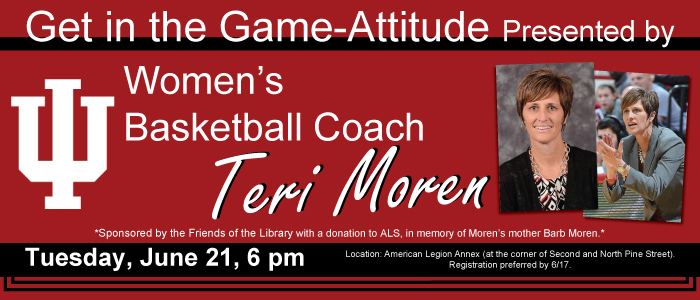 As part of the Jackson County Public Library’s Summer Reading Program, Get in the Game, READ!, Indiana University women’s basketball coach Teri Moren will present a motivational program, Get in the Game-Attitude, at 6 pm, Tuesday, June 21, at the Seymour American Legion Annex (at the Corner of West Second and North Pine Streets). This free Jackson County Public Library program is open to adults and teens. Registration is preferred by June 17, by going to www.myjclibrary.org/events or by calling the Seymour Library at 523-INFO (523-4636). The Friends of the Jackson County Public Library are sponsoring this program with a donation to ALS, in memory of Moren’s mother Barb Moren.
