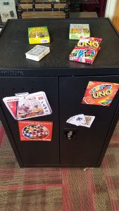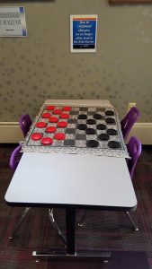 Checkers is on the table, but located beside the staff desk is a cabinet with more games available for anyone to play in the Kidz Korner.