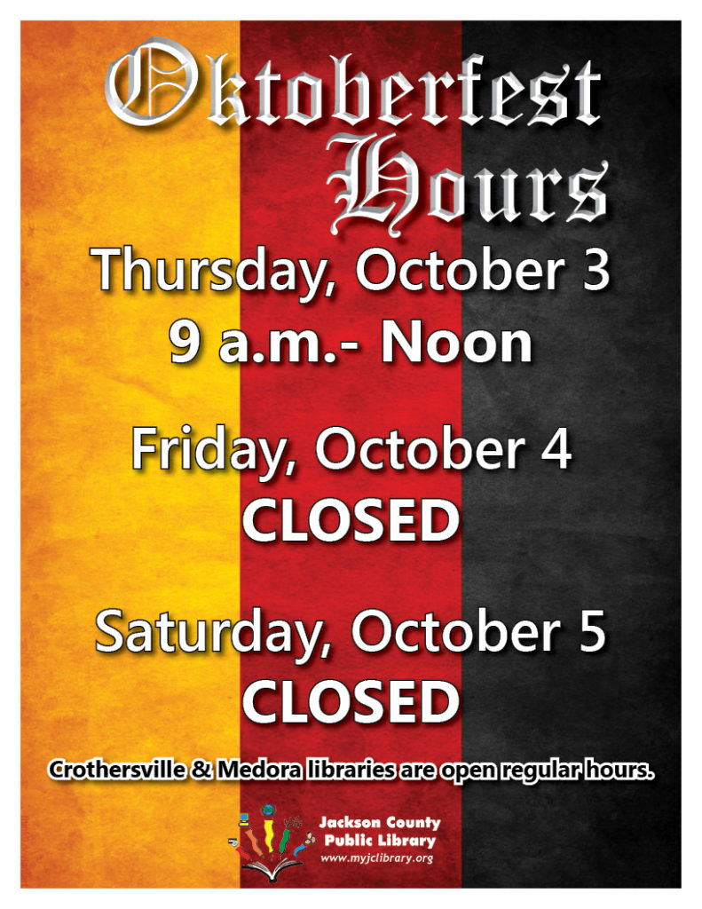 Library Hours During Oktoberfest The Friends of the Library will raise funds for library programs and equipment with $5 parking donations during the festival.