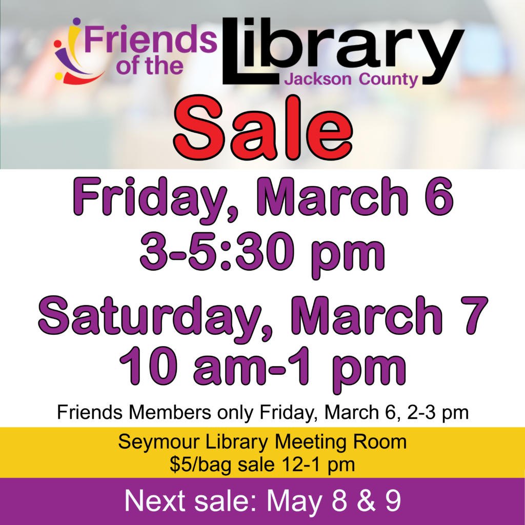 The Friends of the Jackson County Public Library will hold their bi-monthly sale from 3 to 5:30 pm on Friday, March 6, and 10 am to 1 pm on Saturday, March 7, in the Seymour Library meeting room.