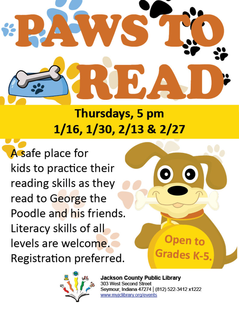 Paws to Read for Grades K-5 Spend time with a furry friend while practicing your reading skills! Please register here for the program.