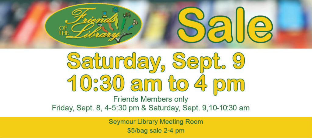 September Friends Sale Don’t forget to stop by the Seymour Library the Friday or Saturday after Labor Day. Members get to shop free, so join our group for early access. You can pay at the door when you get there. Membership starts at $5 for an individual.