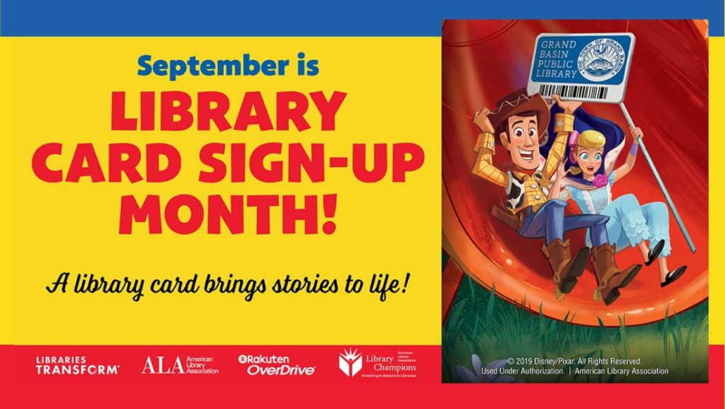 September Is Library Card Sign-Up Month There are so many benefits to having a library card! Free access to books, movies, ebooks, audiobooks, online resources, and more. Come on in and get your free library card today!