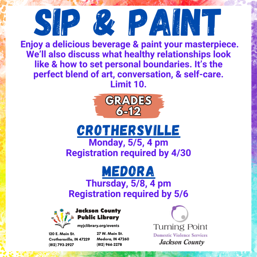 Sip & Paint Register for Crothersville at https://tinyurl.com/4eza4mjs Register for Medora at https://tinyurl.com/bdhkpmj7