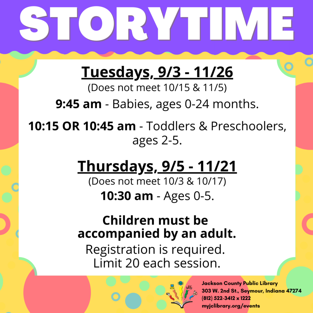Storytime Limit 20 each session. Registration Required. Register at myjclibrary.org/events Children must be accompanied by an adult.
