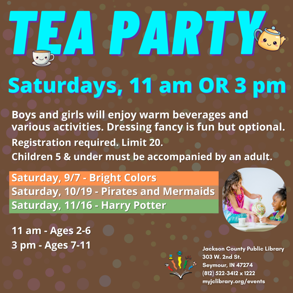 Tea Party Join us for a tea party! Ages 2-6 at 11am Ages 7-11 at 3 pm Registration required. Register at myjclibrary.org/events