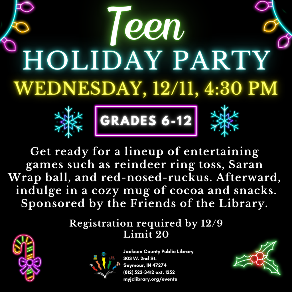 Teen Holiday Party Register at https://jacksoncounty.librarycalendar.com/event/teen-holiday-party-1182