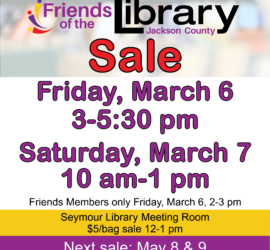 The Friends of the Jackson County Public Library will hold their bi-monthly sale from 3 to 5:30 pm on Friday, March 6, and 10 am to 1 pm on Saturday, March 7, in the Seymour Library meeting room. A special Friends-members-only sale is 2 to 3 pm on Friday, March 6.