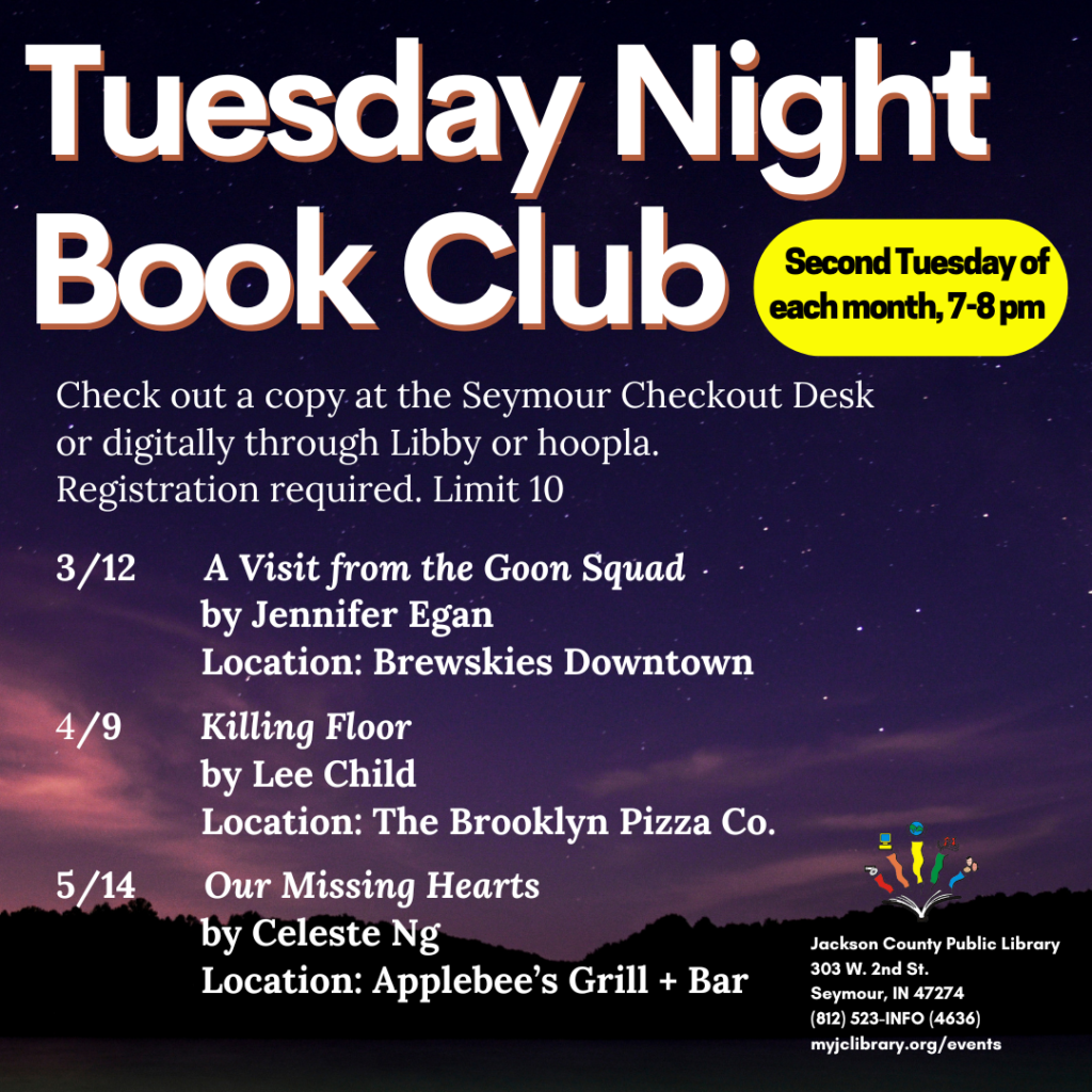 Tuesday Night Book Club Check out a copy at the Seymour Checkout Desk or digitally through Libby or hoopla. Register at myjclibrary.org/events