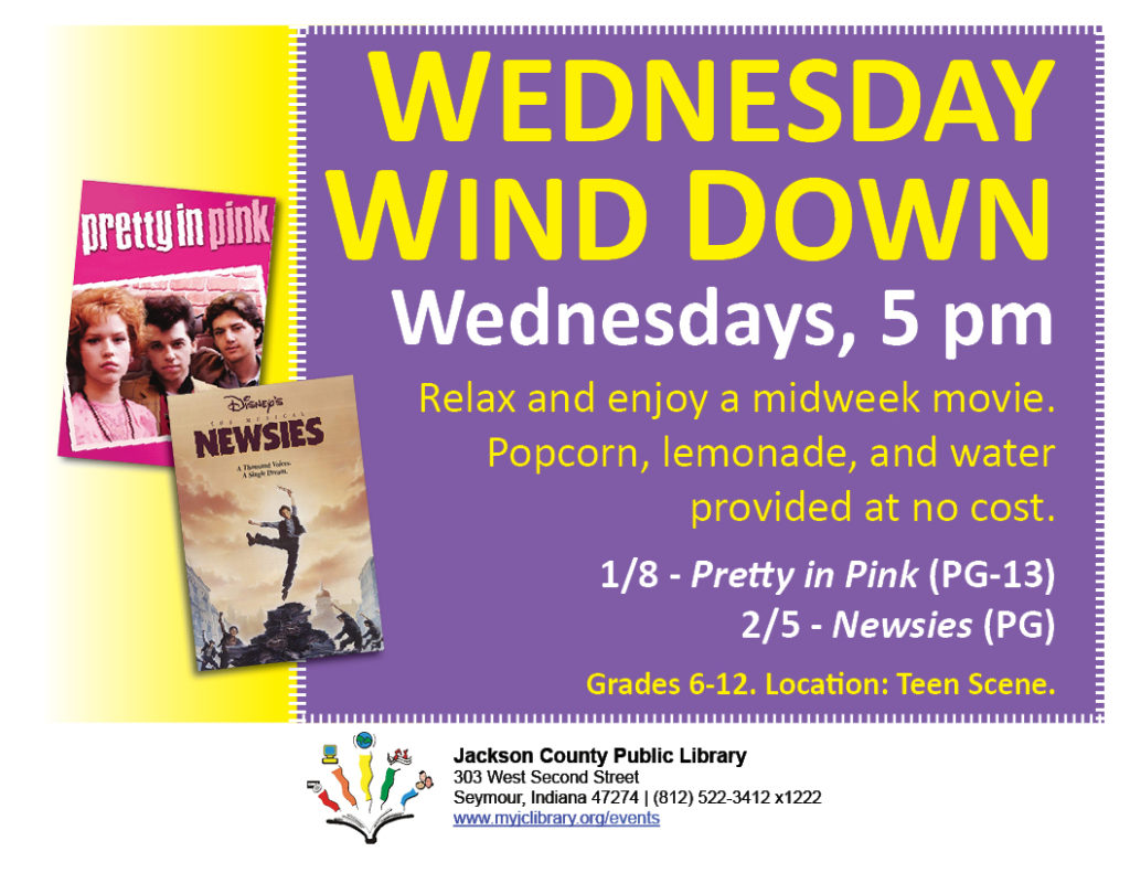 Wednesday Wind Down for Teens January 8th is the first Wednesday Wind Down. Pretty in Pink will show in the Teen Scene at 5 pm. Come and enjoy the movie and refreshments.